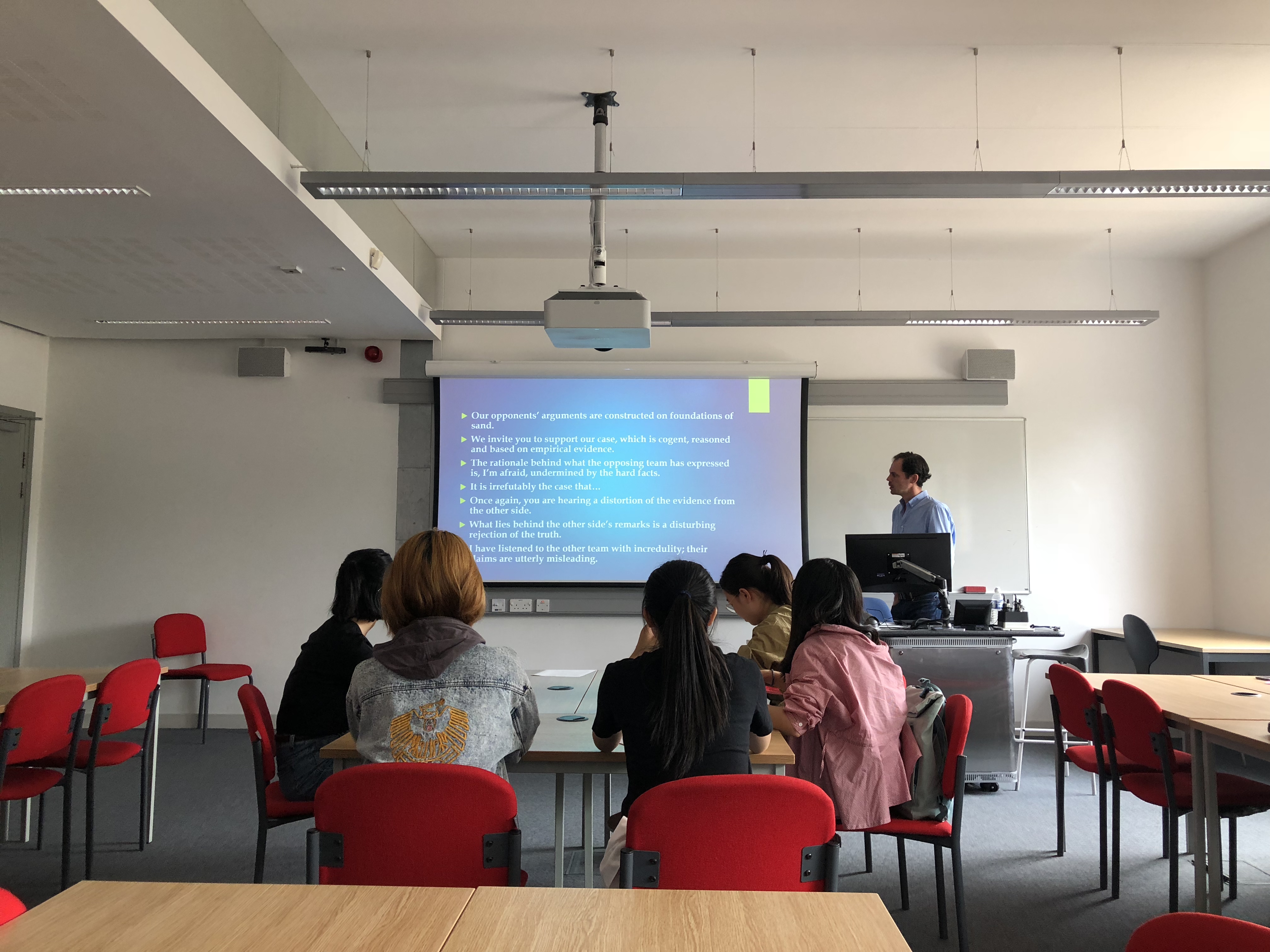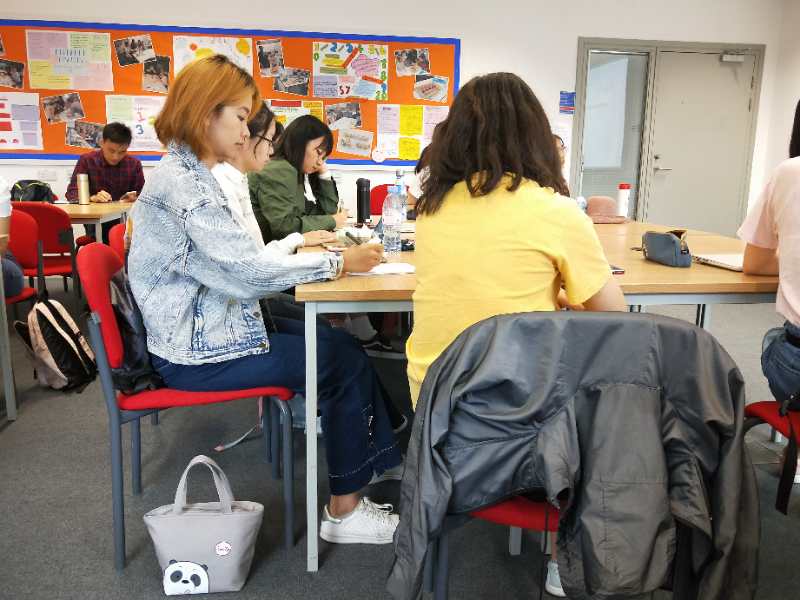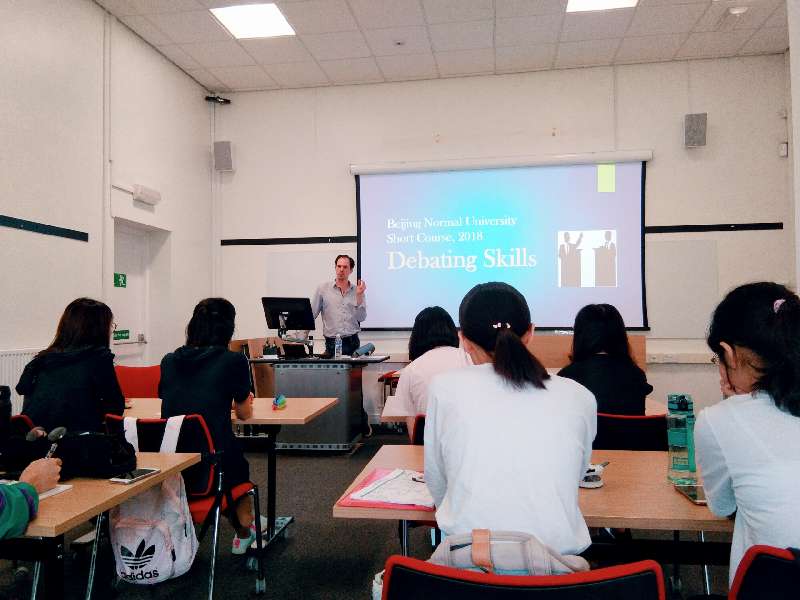 David是一位特别温柔绅士的老师,给大家带来了长达一周的辩论课程。辩论课程采取牛津大学辩论赛模式,David讲授了这种辩论模式的定义、特点、流程以及技巧。在接受了基础理论知识之后,同学们用了两个下午进行组队、定题以及确定分论点,讨论场面异常热烈,David也走到不同小组聆听大家的想法,给了大家非常具有建设性的意见。