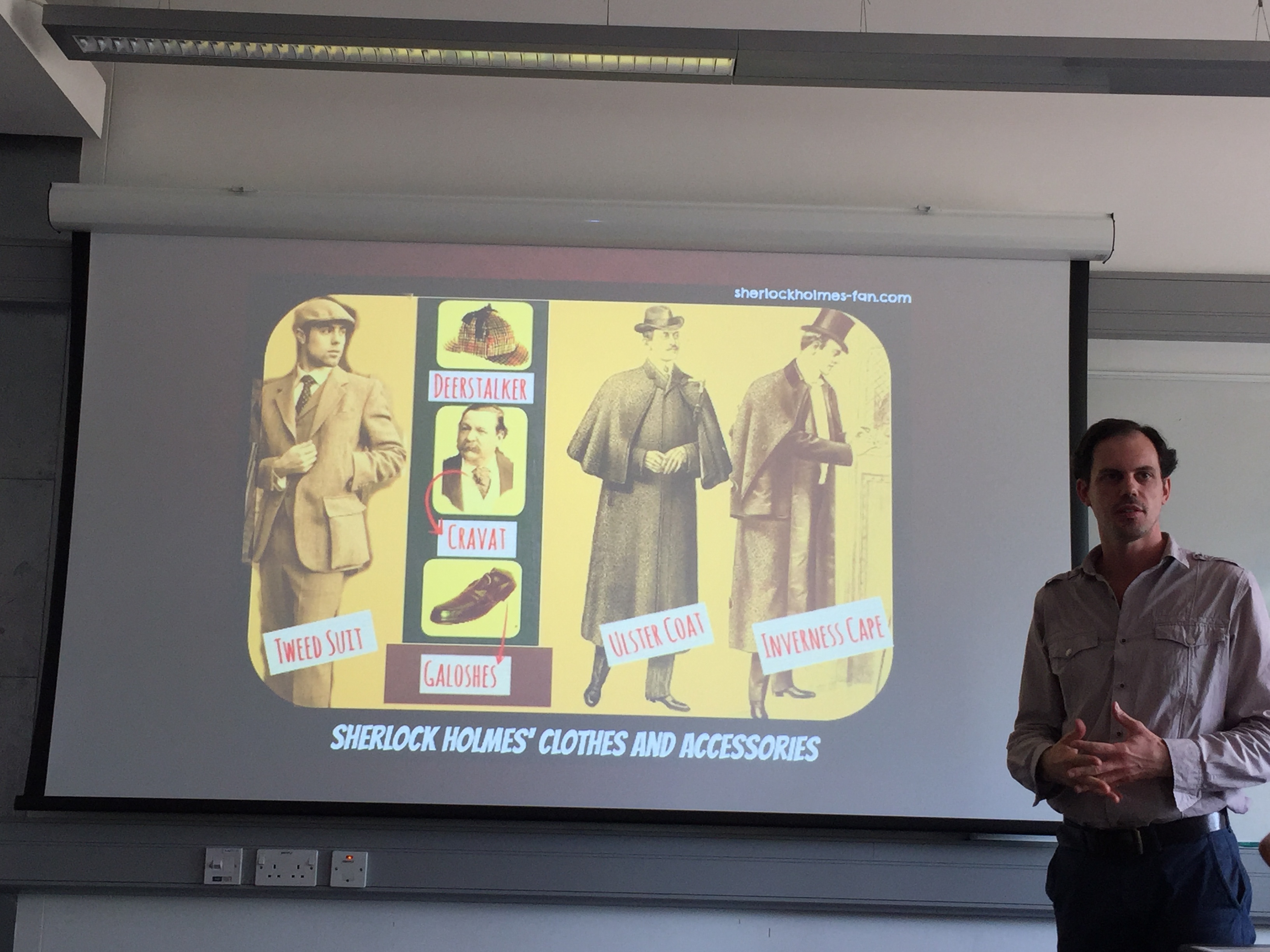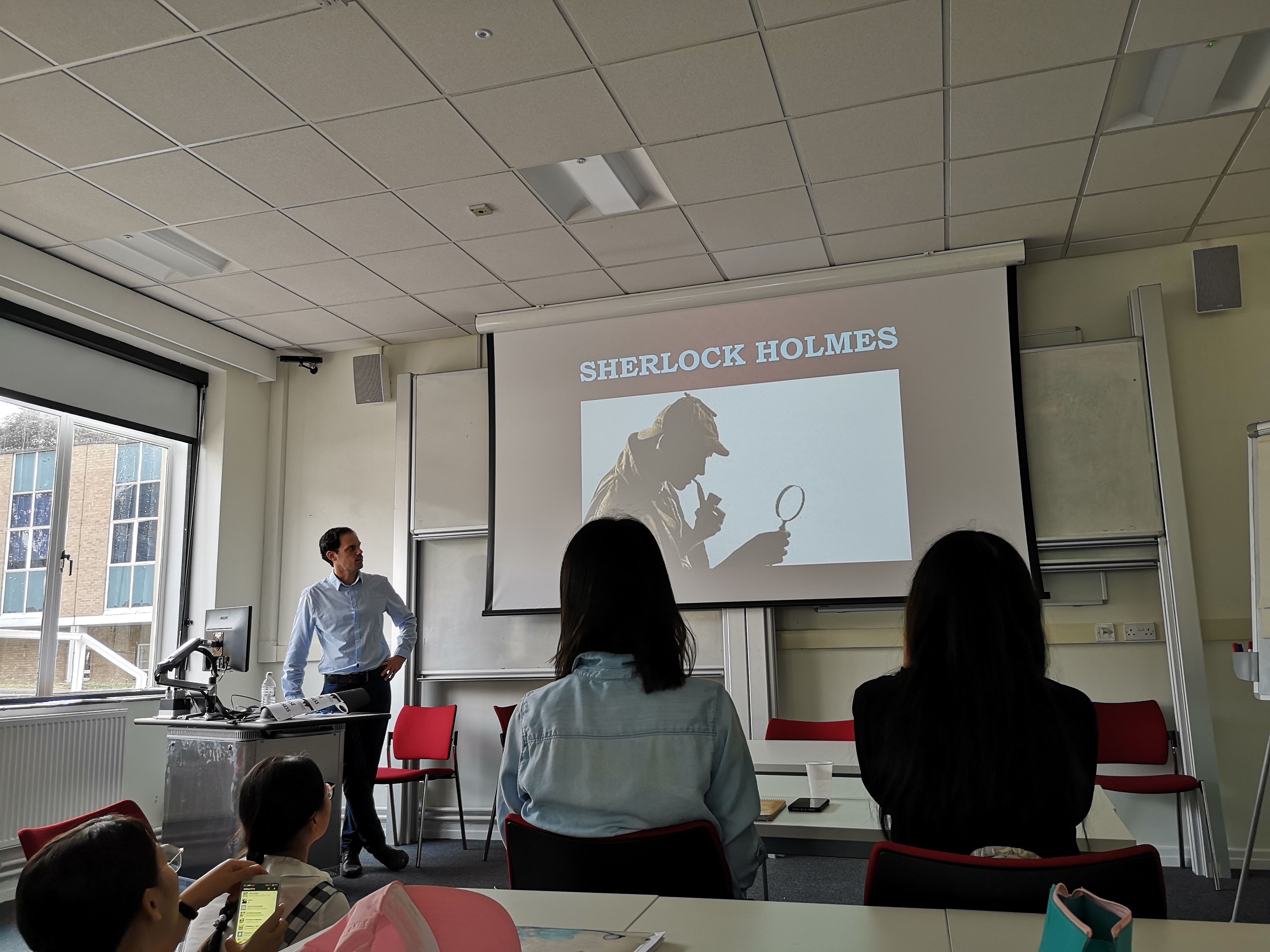 周四上午,David介绍了以福尔摩斯为代表的侦探小说产生的背景、特点以及作者生平的介绍,并且详细地为大家讲授了福尔摩斯典型的服饰穿着,整节课干货满满并且生动活泼。最后一个环节则是留给全体同学,在30分钟的时间内小组合作或独立创作一个侦探故事的情节,之后同学们踊跃地在黑板上图文并茂地展示了自己新奇的小点子,全场掌声热烈。