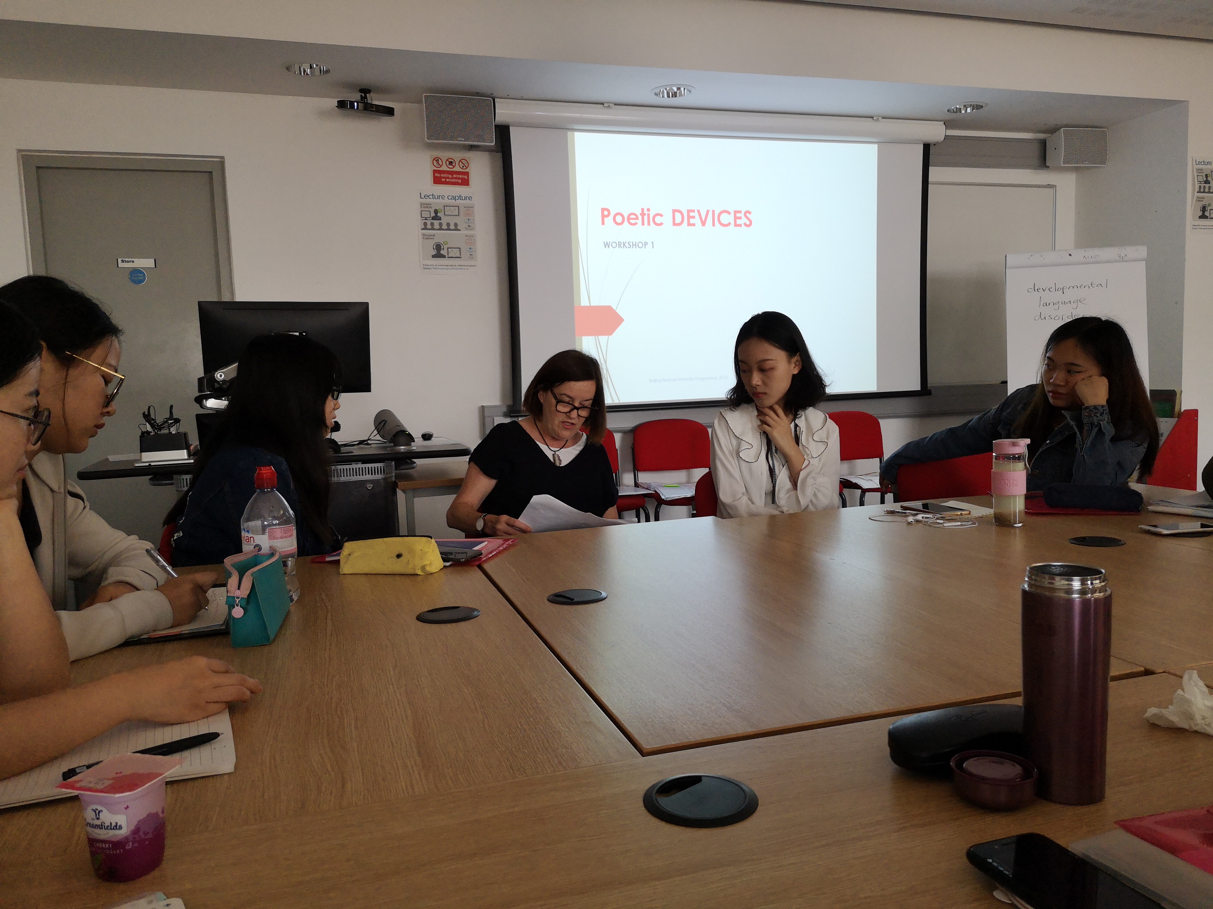 周五上午,Cathy与我们讨论了poetry devices(诗歌手法),比如韵脚、头韵、节奏、重复等,并在每个手法讲解后都鼓励我们运用这些技巧写一小句诗。大家对生活的想象力和观察力令Cathy连连称赞,那一句句大家即兴创作的小诗读起来竟都是那么生动有趣又朗朗上口。终于到了欣赏作品的时候,但Cathy给我们分享的作品却并不来自于那几位耳熟能详的诗人,而是来自于一位当代英国诗人Carol Ann Duffy,题目叫做Valentine(情人的礼物)。但令人惊讶的是,这份情人的礼物,不是娇艳的玫瑰或者甜蜜的卡片,而是一个洋葱。通过close reading(精读)大家都对这首诗感受良多。