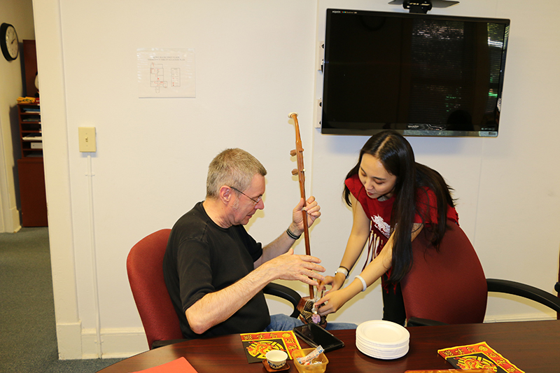 在本次开放日活动中,孔子学院办公区被开辟为四个中国传统文化体验区——剪纸体验区、书画体验区、茶艺体验区和民乐表演区。