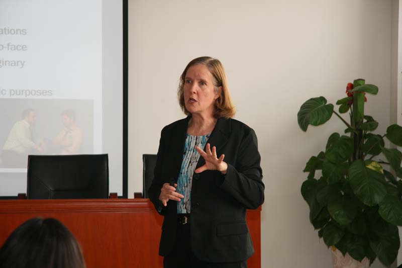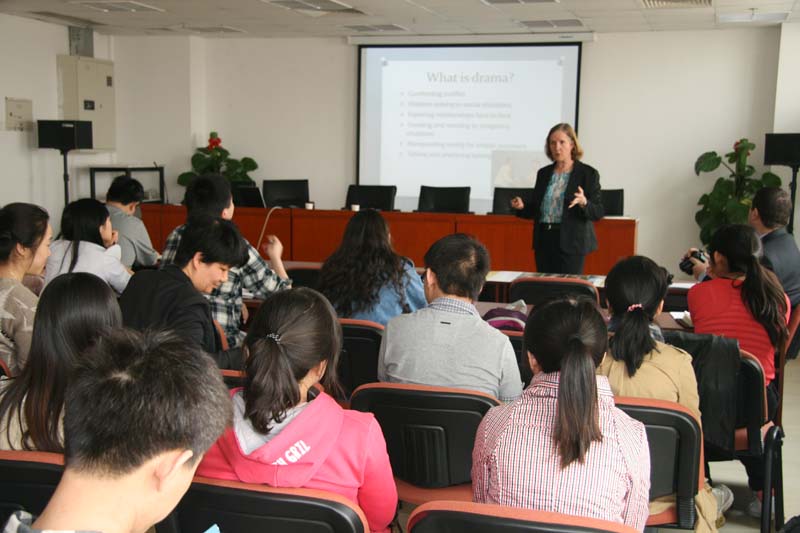 2012年4月9号下午,应外文学院邀请,来自沈阳师范大学的Janet Raskin女士在后主楼914室为91大神师生主持了题为“Incorporating Drama into the Classroom”的工作坊。这次工作坊主要关注戏剧在外语教学实践中的应用。在Janet Raskin 女士的带领下,大家参与和设计了一系列生动有趣的课堂戏剧活动,从中体会到了戏剧可以帮助语言学习者消除焦虑,提高积极性,增强语言能力。这次工作坊形式多样,内容丰富,师生共同参与合作,迸发出许多精彩的火花。最后,Janet Raskin还结合自己多年的教学和研究经验,耐心细致地回答了大家的问题。