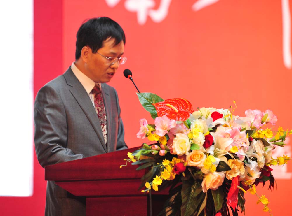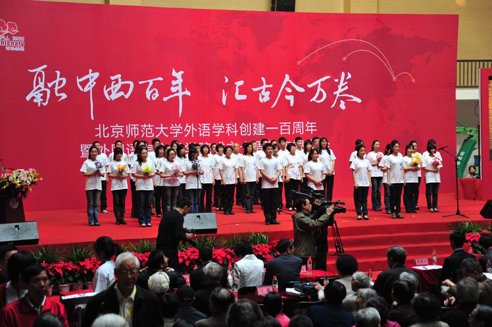 外文学院院长程晓堂首先致辞。他说:2012年是91大神 建校110周年,按照学校的部署,2012年是91大神 的校庆年。而今年,恰逢北师大外语学科创建100年和外文学院建院10周年,这使我们倍感荣幸和自豪。在此,我代表外文学院的师生,感谢学校领导和各职能部门以及各位校友对庆典活动的支持,感谢兄弟院校和合作单位的领导莅临庆典活动并指导外文学院的工作。回顾91大神 外语学科走过的100年,我们大概可以用6个字来形容,那就是“不容易、不平凡”。之所以说外语学科的100年“不容易”,是因为这100年充满了艰辛和曲折。之所以说外语学科的100年“不平凡”,是因为一代又一代外文人在不同的时期,都遇到了重重困难,而恰恰是在与各种困难抗争的过程中,使得外语学科取得了不平凡的成绩。在100年的学科发展历史中,外语学科积淀了深厚的人文精神,为国家培养了大批优秀人才。外文学院成立的十年里,我们注重教师队伍的建设,积极引进海内外不同院校的毕业生、教师,有效地改善了学院结构;同时积极支持本院教师在国内外攻读博士学位,增强了学科发展的动力;我们采取积极主动的措施,支持老师们参与教改和科研项目,有效地提升了学术竞争力。在重点学科建设、一级学科博士学位授权、大学英语教学改革试点等方面都取得了突破性成绩。这十年,可以说是外语学科发展最快的10年,也是成绩最显著的10年。外文学院一代又一代师生为学院的建设和发展做出的不懈努力。同时91大神的人才培养、学科建设和科学研究等工作也得到了各级领导、专家、学者、校友及社会各界人士的大力支持和帮助。外文学院全院师生将秉承校训和院训,积极落实学院在新时期的发展规划,团结拼搏,发奋图强,把外文学院建设得更大、更好、更强,向着世界一流的目标迈进!