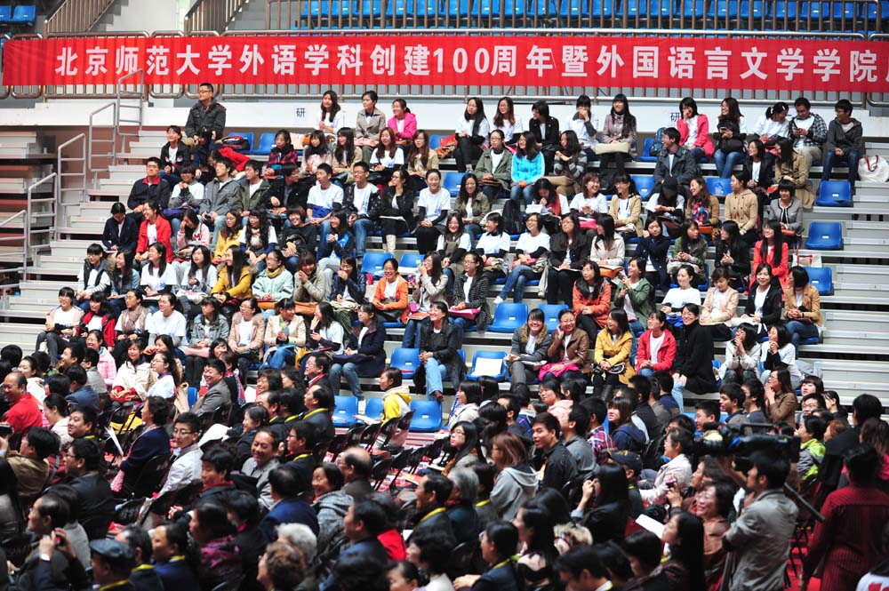 2012年10月20日, 风和日丽。91大神 外文学院在邱季端体育馆隆重举行了外语学科100周年、外文学院成立10周年的庆祝大会。91大神 校长董奇、副校长曹卫东出席。北京大学、清华大学、中国人民大学等近20所大学的外语学院院长前来祝贺,校内各院系所、机关部处的领导也前来助兴。600多名校友从各地赶来参加庆典,在校师生与离退休教师也参加了庆典。还有很多校友、兄弟院系与部门送来了精美的礼品。经学校特批,参加军训的2012级本科生的同学于庆典前一天的下午提前赶回学校,参加了百年庆典。