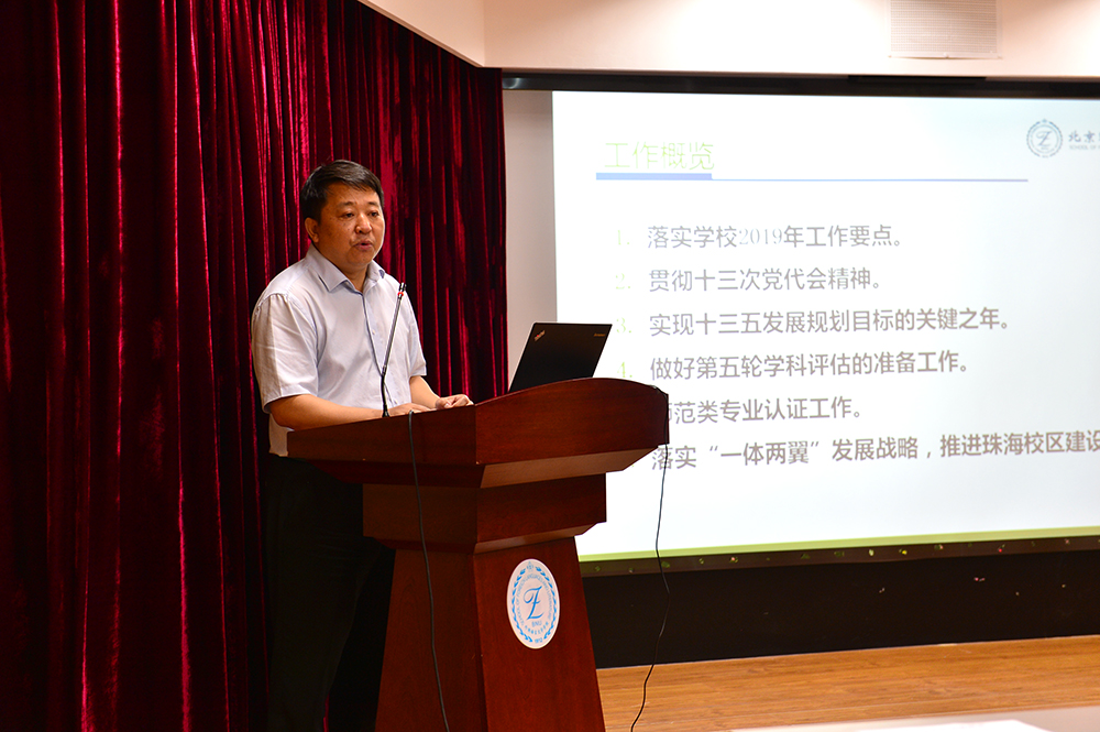 院长苗兴伟在会议中为老师们介绍了学校2019年工作要点,他提出今年是实现十三五发展规划目标的关键之年,外文学院要做好第五轮学科评估的准备工作、做好师范类专业认证工作,从人才培养、科学研究、队伍建设、国际化、社会服务五方面完成外文学院2019年学科建设目标。