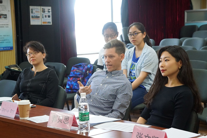 比赛间歇,MODEL APEC创始人郭贝思女士强调Model APEC重视培养一个选手的综合能力。她希望我们的选手在训练自己的语言表达能力的同时也能够更加关注APEC会议的本身,为自己在比赛中表达观点是充实更加有事实依据的论据。同时她还对选手提出了礼仪、服饰和形态相关的要求。Chris Ott则向选手们强调了语调和语言使用的问题,他表示在发表观点时适当的运用语调能更加吸引对方的注意,同时在阐述是应尽量避免绝对性的词语。张文凯师兄也用自己的实际比赛经验和选手们强调了专业化知识的重要性。他希望选手们能在将来的比赛中能够更好地平衡英语语言的使用和专业化知识之间的关系。