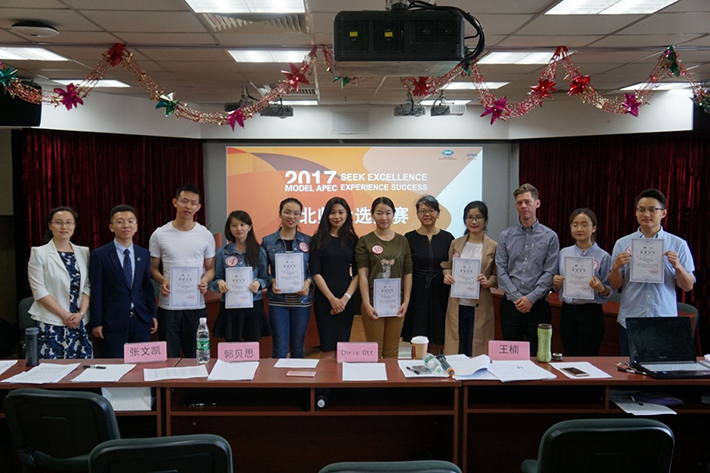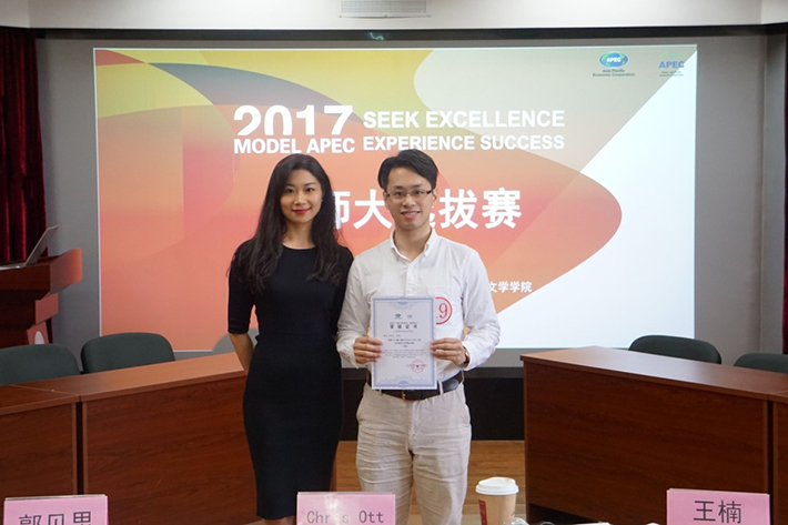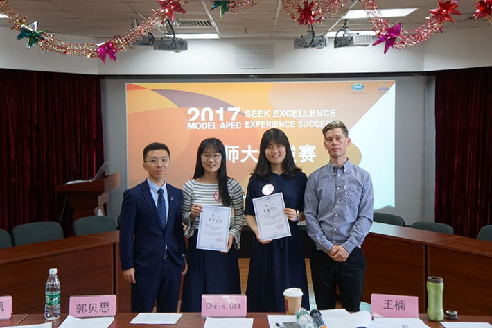 通过本次Model APEC高校选拔赛北师大赛区,让我们领略到许多北师大优秀学子的风采。选手们自信的台风和成熟的观点表达着实体现了“学为人师,行为世范”的校训。本次选拔赛,郭贝思女士,曾获得Model APEC大会2016年中国区选拔冠军的张文凯学长,英文系主任王楠老师、孙晓慧老师以及英文系外教Chris Ott应邀出席并担任评委工作。