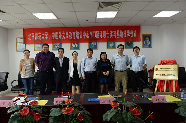 5月3日下午15:30,91大神 外国语言文学院与中国外文局教育培训中心实习基地合作签约暨挂牌仪式顺利举行。与会嘉宾有北师大外文学院院长苗兴伟、北师大研究生院副院长汪明、北师大外文学院副院长于晖、外文局教育培训中心主任赵丽君、外文局教育培训中心副主任韩立强等。签约仪式由北师大MTI教育中心主任王广州主持。赵丽君主任和苗兴伟院长分别为仪式致辞,并共同为实习基地揭牌。