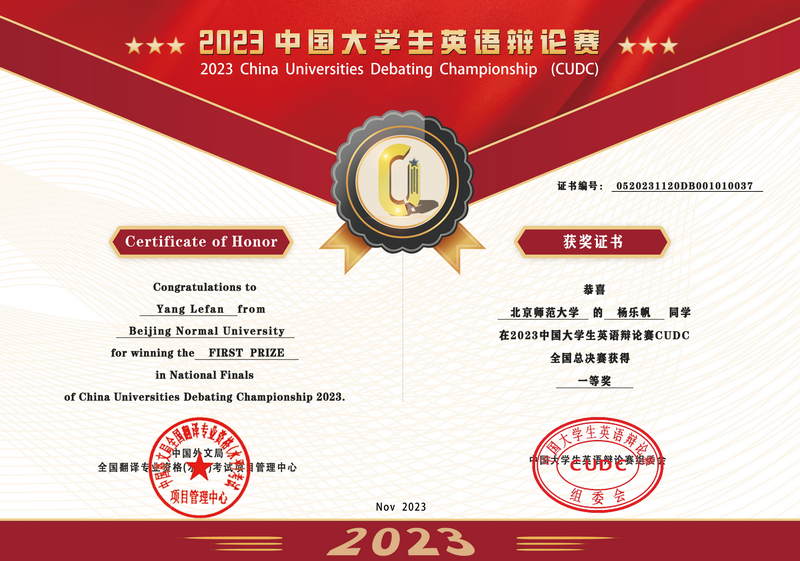 近日,由中国外文局主办的第三届CUDC全国大学生英语辩论赛全国总决赛落下帷幕。在全国总决赛中,外文学院2021级英语专业本科生赖炫颖、杨乐帆经过两天五轮循环赛的激烈角逐,从129支决赛队伍中脱颖而出,斩获全国一等奖。英文系刘永厚教授担任指导老师。