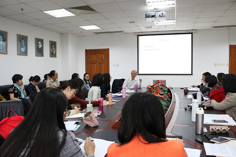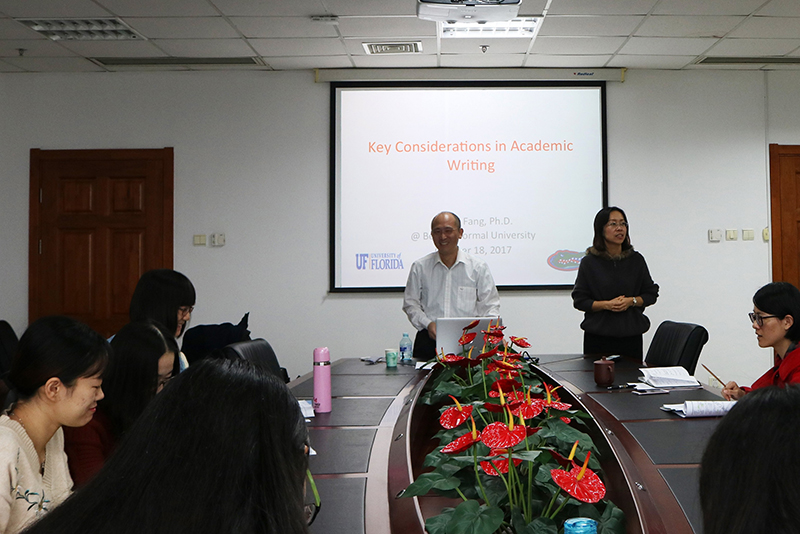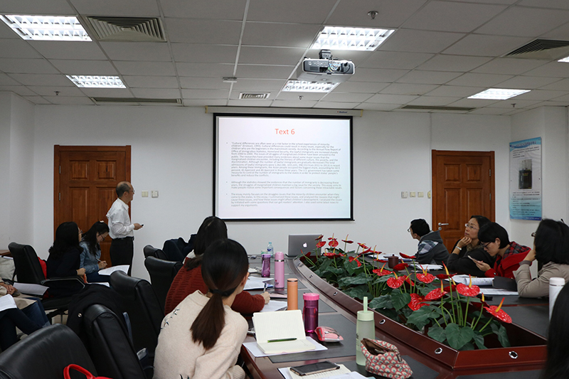 2017年10月17日、18日,91大神 外文学院于后主楼1020室成功举办“功能语言学与教育”系列讲座。讲座共4场,主题分别为Teaching reading with academic/disciplinary texts, Teaching writing in the discipline: A genre-based approach, Disciplinary literacy in mathematics: Beyond ESP, 以及Key considerations in academic writing。本次讲座有幸邀请到了普渡大学博士、现任美国公立常春藤佛罗里达大学教育学院正教授、博导、语言和读写教育专业负责人的方志辉教授作为主讲人。