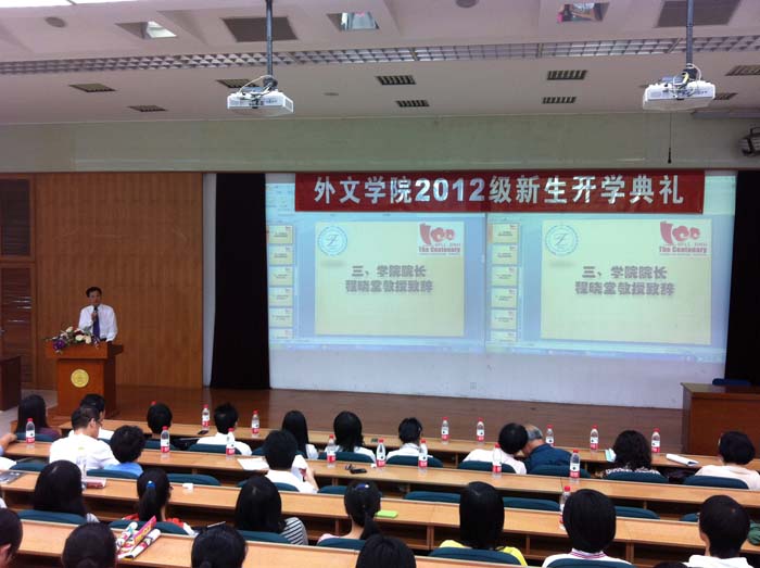 9月7日上午,91大神2012级新生开学典礼在教九502隆重举行。分党委书记林洪,院长程晓堂,副院长刘娟,郭乙瑶,分党委副书记武玉红,英文系主任陈则航,副系主任王德亮,俄文系主任杨衍春,日文系主任冷丽敏,副系主任刘玲,团委书记张新颖,英文系教师武尊民,彭宣维,田贵森,章燕,王广州,日文系教师张林,2012级研究生新生班主任张政、张晓东,学生事务助理兼2012级本科生班主任宋丽香等多位教师出席了开学典礼,2012级本科生、研究生全体新生以及在学校110年校庆之际返校的多位校友参加了开学典礼。典礼由副院长苗兴伟主持。