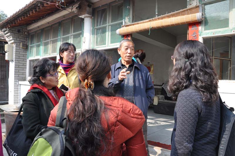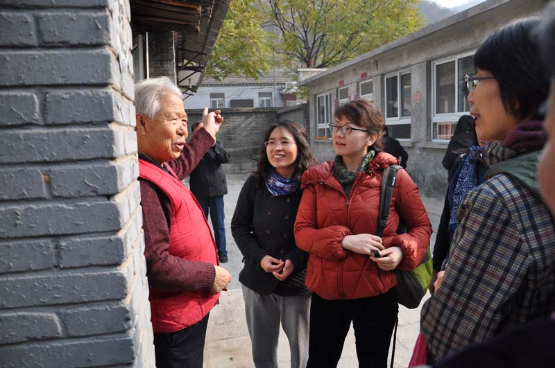 听完介绍之后,外文学院一行人告别了李镇长,在张科长带领下,来到了西马各庄村和东马各庄村,走街串巷,走访农家。正如李镇长所说的那样,街道里十分干净,见不到任何乱扔的塑料袋或纸屑,家家户户门口整洁,院内摆放整齐,垃圾桶内的垃圾都在一早被收走了。老师们与村民攀谈起来,热情的大爷、大妈毫无保留地介绍着他们的家庭以及垃圾的分类。走在路上,张科长指着一条水道告诉我们,2012年“7.21”爆发山洪的时候,水道里布满了水,但是水里没有任何的白色垃圾漂浮,王平镇的垃圾分类经受了考验。