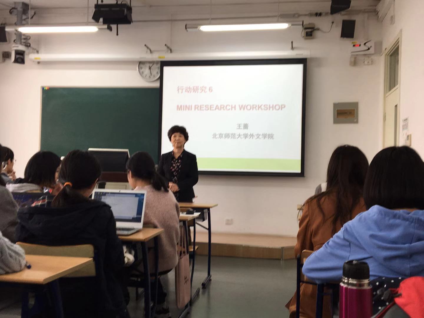 之后,三位副院长在教四楼305教室集体观摩学习了王蔷老师的《教师行动研究》课程。本次课程的授课主题为小型研究工作坊。授课对象为2016级英语专业本科生。王蔷老师教学富有激情及感染力,教学内容丰富,适合本科生认知能力,教学过程中师生互动频繁,学生学习和参与状态非常好,是教师们学习的榜样。