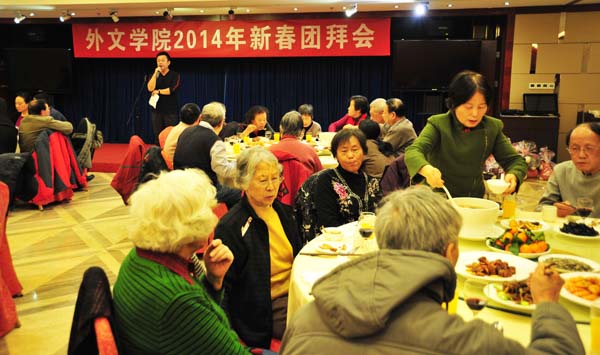 2013年12月27日,外文学院在京师大厦兼味轩举办了2014年离退休教师新年团拜会。这是外文学院坚持10多年的一项活动。学院党政班子及各系部室负责人参加了团拜会,为离退休教师祝贺节日快乐。