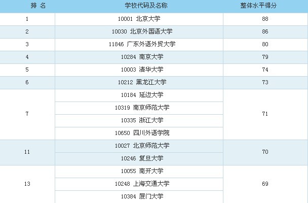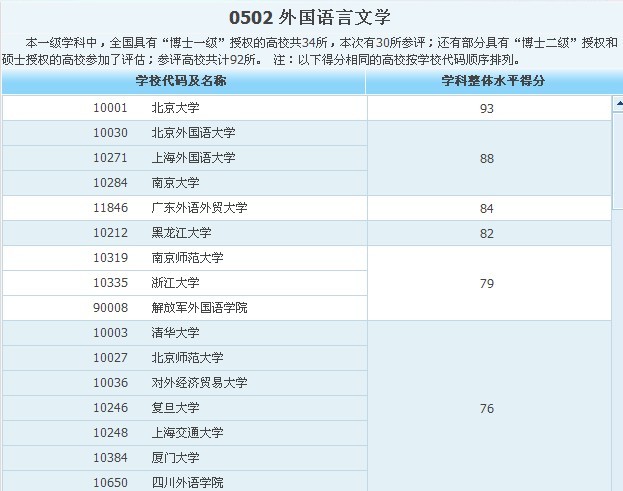 根据2013年1月29日教育部学位与研究生教育发展中心发布的2012年一级学科评估结果,外国语言文学一级学科在全国排名第10位。比2007-2009年的第二轮评估,提升了一个位次。