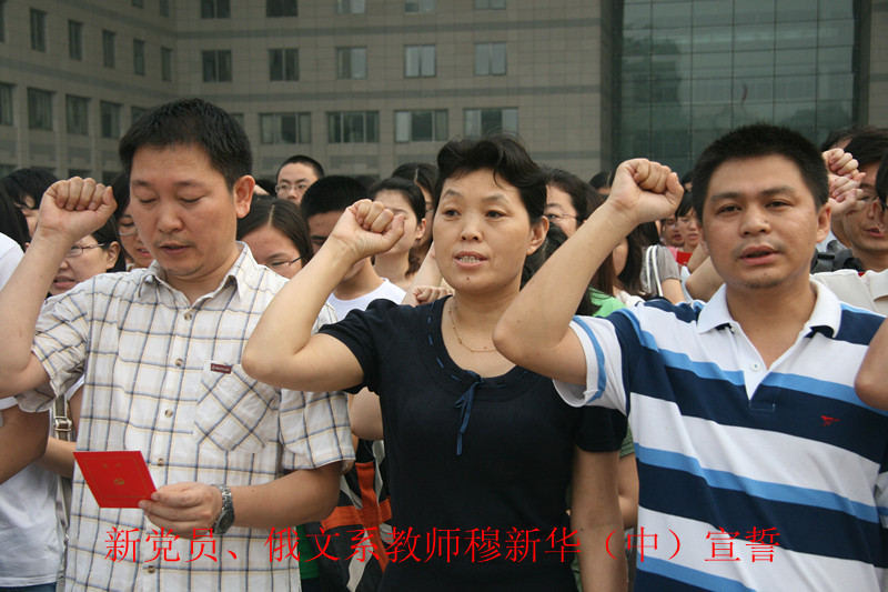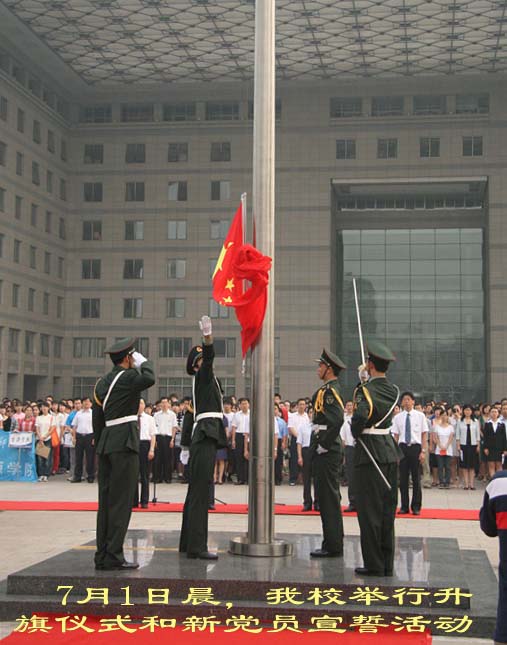 2012年7月1日星期日早上6:30,外文学院部分教师党员和学生党员们早早就来到主楼广场前集合,参加学校组织的庆祝中国共产党成立91周年升旗仪式暨新党员宣誓活动。分党委书记林洪、副书记武玉红、团委书记张新颖、新教师党员穆新华以及70余名本科及研究生党员同学们参加了这次活动。