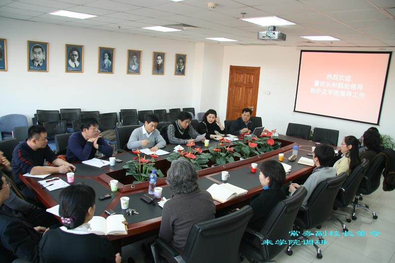 2012年1月5日上午,常务副校长董奇、校长助理张凯、学校发展委员会主任范立双、人事处副处长杨红英前来外文学院调研。此次调研,是校领导“走基层”活动的一个环节。
