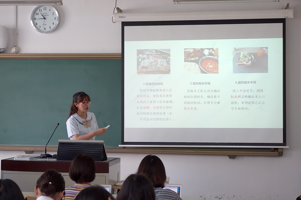 针对这些问题,2016级的4位同学做了充分的准备,制作了内容充实的PPT为大家进行说明。首先,樊静怡介绍了大三赴日留学的优缺点,以及如何选择留学的学校;随后,袁嘉彤介绍了留学的申请流程以及出国前后的相关手续;冯昕旸结合自己的亲身经历,为大家讲述了留学期间有哪些值得做的事;最后,杨茗美介绍了在日本留学生活的注意事项。