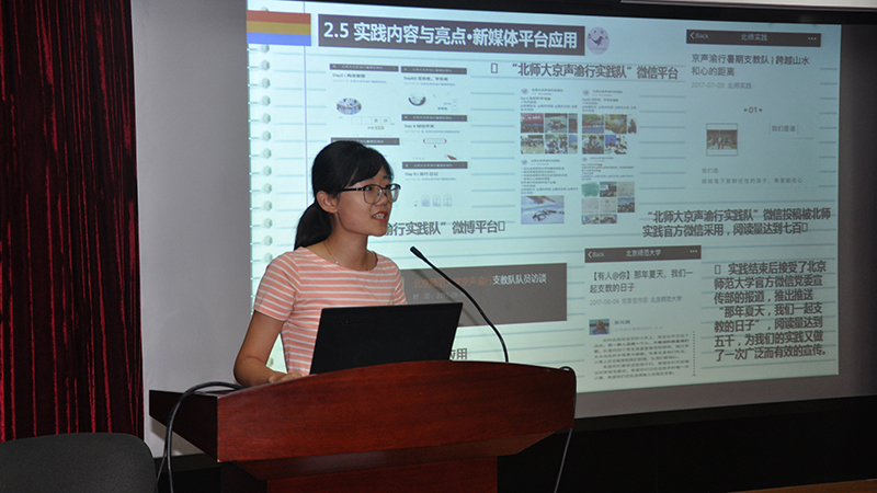 在活动中,京声渝行暑期实践队、“E生有你”暑期支教实践队、青苗暑期实践支教队、Oasis(绿洲)研究生支教队、外文学院赴山西E•Joy实践队、“梦支队”土族刺绣调研队、赣协C9+1支教团北师分队、青海循化调研队以及冰雪祁源·ICE调研队分别对本队暑假实践成果进行展示,在答辩环节认真地回答了评委的问题。