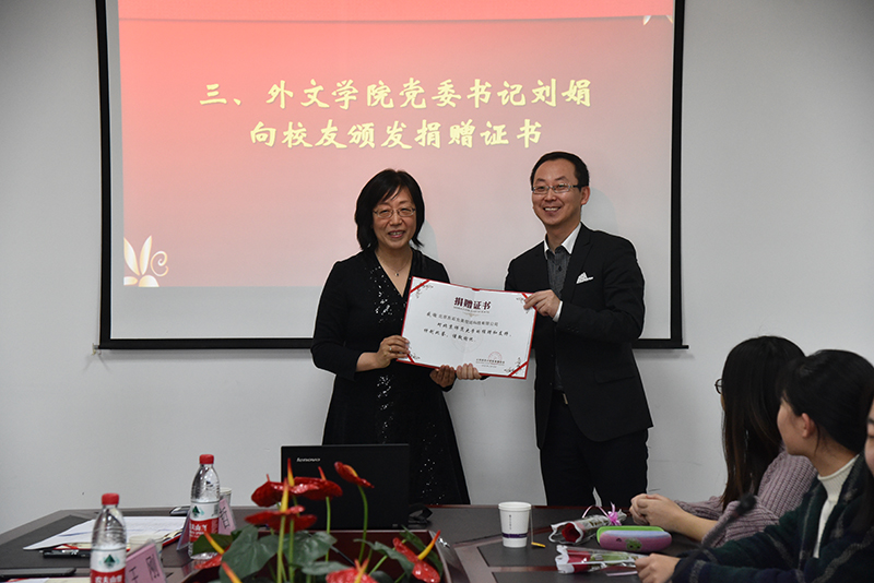 3月8日,“中和西琴”励学金基金二期捐赠暨颁奖仪式在外文学院后主楼1020会议室举行。基金创始人苏昊学长、二期捐赠方北京东石北美牧场科技有限公司副总经理王刚学长、94届校友代表刘云凤学长、93届校友姜浩学长、学校校友工作办公室、教育基金会、外文学院的相关负责人参加了仪式。