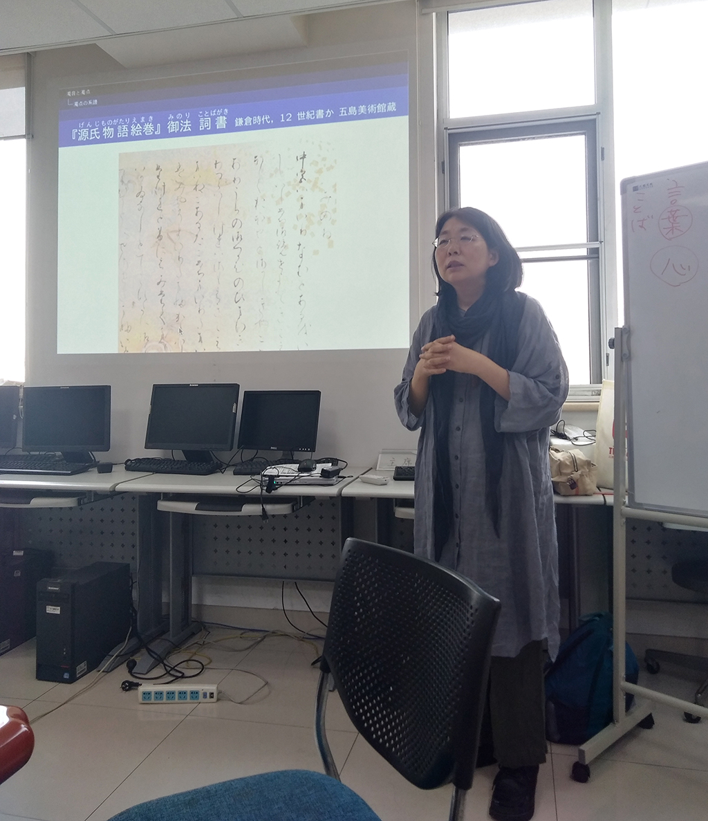 2018年9月10日上午,金城学院大学文学部中川美和老师应我系邀约,于后主楼1018做了“假名内外——浊音表记的变迁”为题的讲座。讲座由日文系刘玲老师主持,包括日文系本科生、研究生以及文学院博士生、留学生在内的近四十余人前来聆听了讲座。
