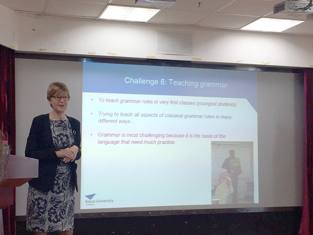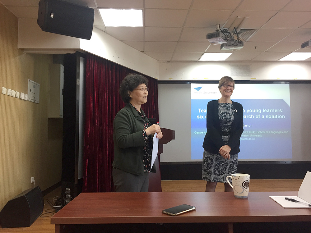 讲座前,王蔷教授以幽默风趣的语言介绍了Sue Garton博士。Sue是英国阿斯顿大学应用语言学(TESOL)的高级讲师,语言与社会科学学院对外关系副院长,以及语言研究中心主任。她有多年与国际英语学生及教师工作的经验,曾在多国担任TESOL相关的客座讲师,是语言教师教育、少儿教学、教育政策与课堂互动方面的专家。