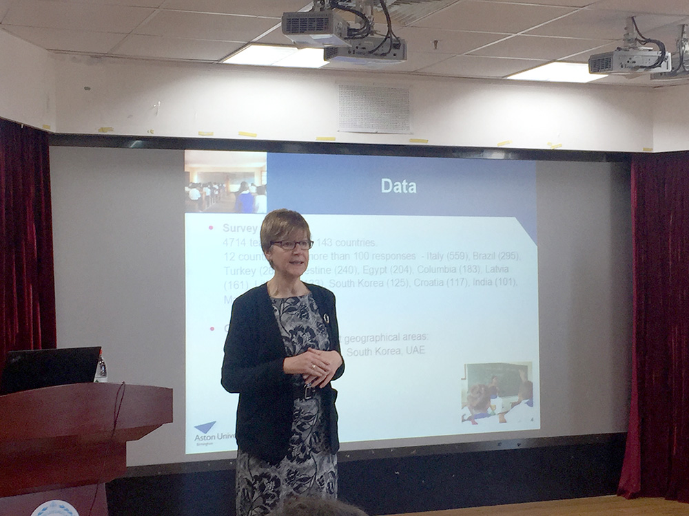 讲座开始,Sue博士首先探讨了少儿英语教学(TEYL)的背景。受经济全球化、语言习得理论以及教育政策等多方面因素的影响,少儿语言教学也许是当今世界教育政策的最大发展领域。在此背景下,她采用了定性和定量的研究方法,在143 个国家对4714名教师开展问卷调查,并选取了5个国家进行了个案研究。