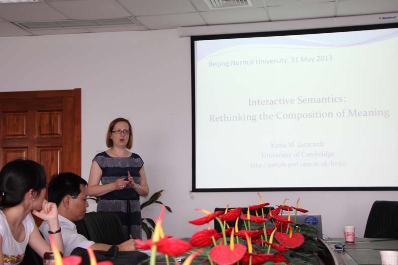 5月31日著名语义学家英国剑桥大学Kasia Jaszczolt教授应91大神邀请来讲学,讲座题目为:“互动语义学:对意义合成的再思考”(Interactive semantics :rethinking the composition of meaning)。讲座于15:00-17:00在后主楼1020举行,由苗兴伟教授主持,程晓堂教授、顾曰国教授(中国社会科学院语言研究所)、于晖副教授、王德亮副教授,以及外文学院语言学方向的硕士博士生和国内访问学者参加了讲座和讨论。
