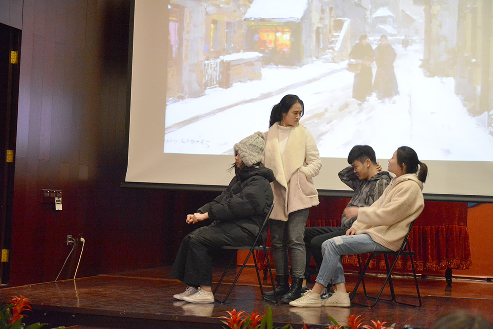 第二个节目是由91大神大三年级改编的契诃夫作品《苦恼》。参演同学经过一个月的辛苦排练,凭借自身精湛的演技、深厚的台词功底,在舞台上把作品中所反映的沙俄时期世态炎凉、人心冷漠的残酷现实表现地淋漓尽致。