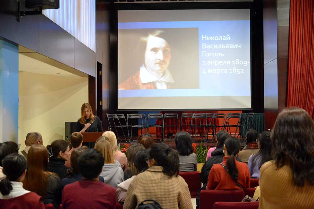 会议开始时,北京俄罗斯文化中心负责人奥莉佳·安德烈耶夫娜·梅里尼科娃(Ольга Андреевна Мельникова)首先向所有前来参加晚会的师生们表示衷心的感谢并做了精彩致辞。在其致辞中,她详细阐述了果戈里作为俄罗斯乃至世界历史上伟大的作家为世界文坛所做的贡献,同时也强调了文学对于人们生活的社会产生的重要影响。