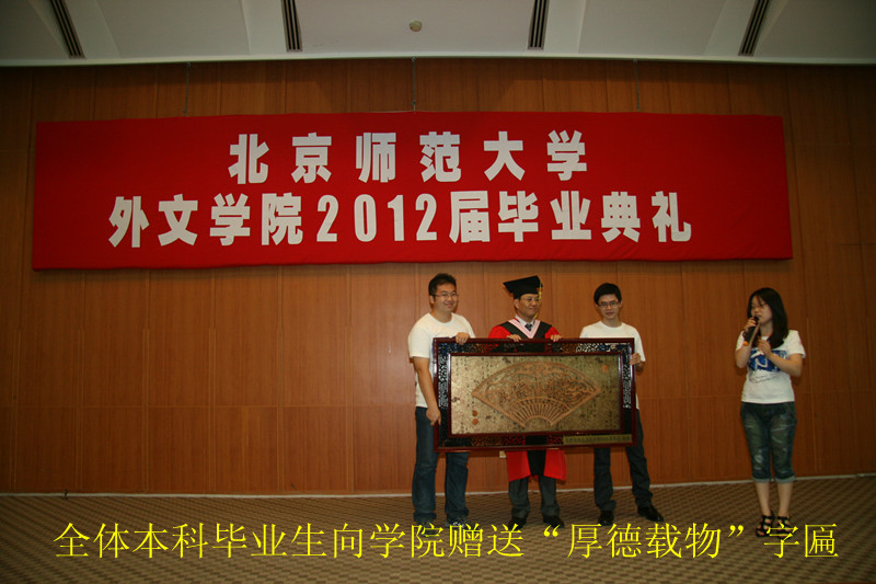 2012年6月27日下午,外文学院2012届毕业典礼暨学位授予仪式在英东学术会堂隆重举行。院长程晓堂、副院长苗兴伟、刘娟,学院分党委副书记武玉红,学位委员会委员武尊民、章燕、宛金章、翟东娜、夏忠宪、王焱华等出席学生毕业典礼。学院各系、部主任、副主任、毕业班班主任,学院办公室主任方芬、学院分团委书记张新颖等出席了毕业典礼。毕业典礼由副院长刘娟主持。