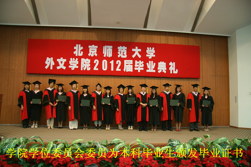 毕业典礼结束后,开始了隆重的学位授予仪式。在欢快的乐曲声中,外国语言文学学位分会主席程晓堂老以及学位分会的7位老师分别为毕业博士生、硕士生颁发毕业证书、学位证书;学位分会委员们分别为本科毕业生颁发毕业证书、学位证书。