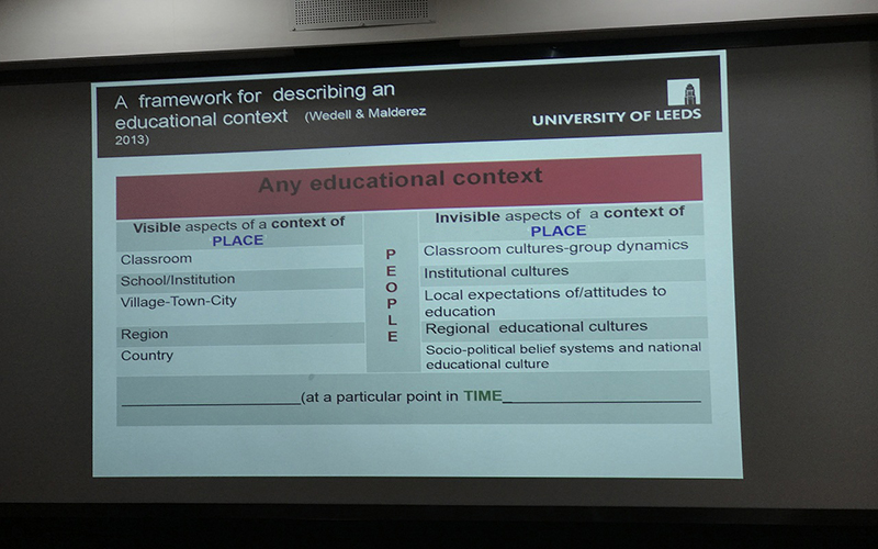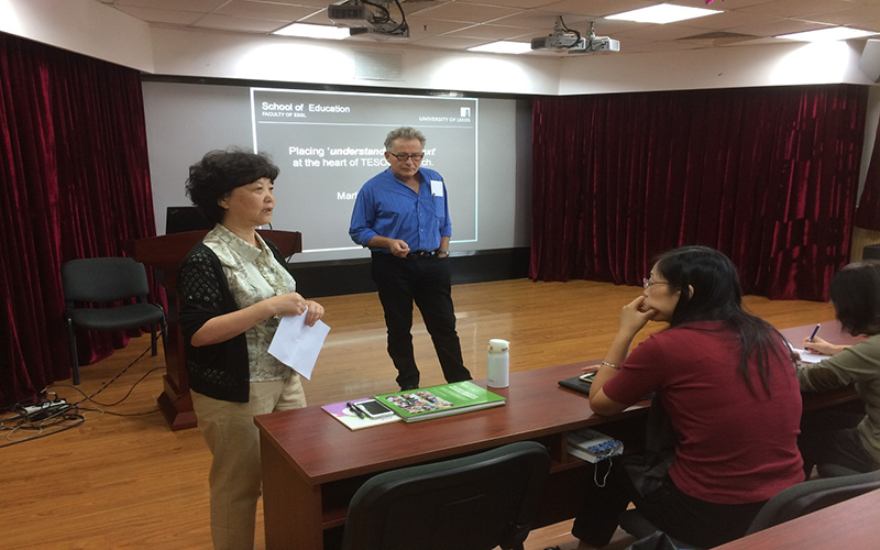 Martin的工作坊由三部分组成。第一个环节是与听众一起探索”TESOL context”这个术语的涵义;第二个环节是讨论为什么旨在理解教师和其他改革实施者如何思考和行动的研究需要定位在所发生的环境中才有意义;第三部分是以他学生的博士论文题目为例,讲解在分析数据反映了什么情况时考虑研究背景和环境影响因素的重要性。Martin指出虽然educational context各不相同是常识,但是研究者们在研究分析的过程中却时常疏忽context的影响。因而他提出一个描述任何educational context的框架,包含“Place, People, Time”三个要素。Place又可以从visible和invisible两个维度进一步细化到有形的教室、学校、农村等地方和无形的经济、文化、信仰等方面。Martin的工作坊主题虽然属于宏观层面,但它体现在了微观的方方面面,给在场听众非常多的启发,现场互动频繁,针对在场听众提出的论文题目,Martin当场用educational context框架帮助分析论文研究应该考虑的要素。有学生表示听了工作坊对context这个概念有了更深的感触,对解决实习中遇到的一些困难很有帮助,充分理解环境中有形和无形的影响因素将会使课堂上培养学生运用语言能力的英语教学更加有效。