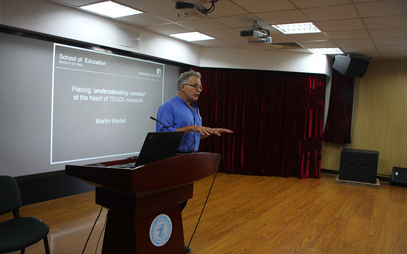 2017年9月22日上午8:30,91大神 外文学院外语教育与教师教育研究所外籍专家工作坊在后主楼914举办。本次工作坊邀请了英国利兹大学教育学院国际教育中心主任Martin博士主讲,外教所王蔷教授主持。工作坊主题为” Putting ‘understanding context’ at the heart of TESOL research”。副院长陈则航教授、英文系副主任孙晓慧副教授、外文学院其他老师以及博硕士研究生、访问学者等五十几人参加了工作坊。