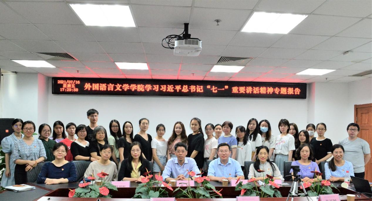 张凯副校长为报告会做总结讲话,同与会人员分享了自己到天安门广场参加庆祝中国共产党成立100周年大会的经历和感受、讲述了庆祝大会幕后的故事,用生动的事例阐释了中国共产党“执政为民”“以人民为中心”的理念和宗旨。张凯指出,外文学院要充分发挥学科优势,在党史教育过程中主动探索中国文化海外传播的新路径,在传播中国方案、中国智慧方面争取做出更大贡献。他强调,党员同志要坚持党史学习常态化、通过学习不断坚定理想信念,充分发挥先锋模范作用。