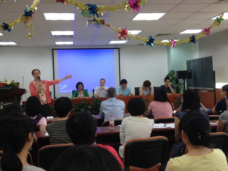 讲座由北师大外文学院教师David Chiesa主持,上午的第一场讲座从9点开始。主讲人Leslie Grover女士做了“Critical Thinking and Reading Comprehension: Building the foundation”的主题分享。她结合自身教学经验,鼓励各位老师重视学生的学习方式,培养学生批判性思维。第二场讲座主讲人Carolyn Wedral女士与大家分享口语教学的新方法,并现场一一示范。例如,她邀请五位与会者作为学生代表,组成专家小组(panelists),以“不同的婚姻观念”为话题组织了全班性互动参与的的口语活动,并在每个活动环节解释具体实施的要点,引起教师们的热烈响应。第三场讲座Bruce先生给我们分享了Content-based Language Teaching的要点,并现场通过工作坊的形式让大家对这些要点有了更深刻的了解。第四场讲座主讲人Jim Raddebaugh与大家分享了“Bringing Effective Listening Practice into the Classroom”这一主题,主要介绍了教授听力的五大原则,并让大家运用这五大原则设计出一堂课与听众分享,激起了在场观众的参与的兴趣,将本次系列讲座推向高潮。