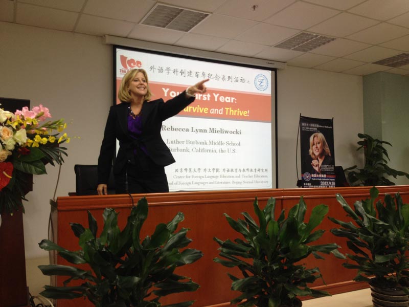 9月10日教师节当天,第62届美国年度国家教师大奖获得者Rebecca Lynn Mieliwocki(瑞贝卡•米勒沃基)受91大神外语教育与教师教育研究所的邀请,在后主楼914为广大师生做了题为“Your First Year: How to Survive and Thrive!”的精彩讲座。本次讲座为外文学院纪念91大神 外语学科创建一百周年的系列活动之一,由91大神博士生胡亚琳主持,现场座无虚席,高潮迭起。