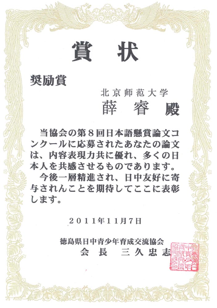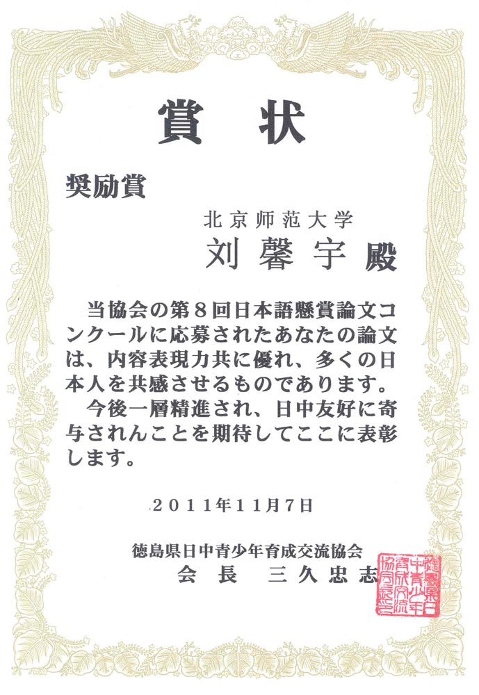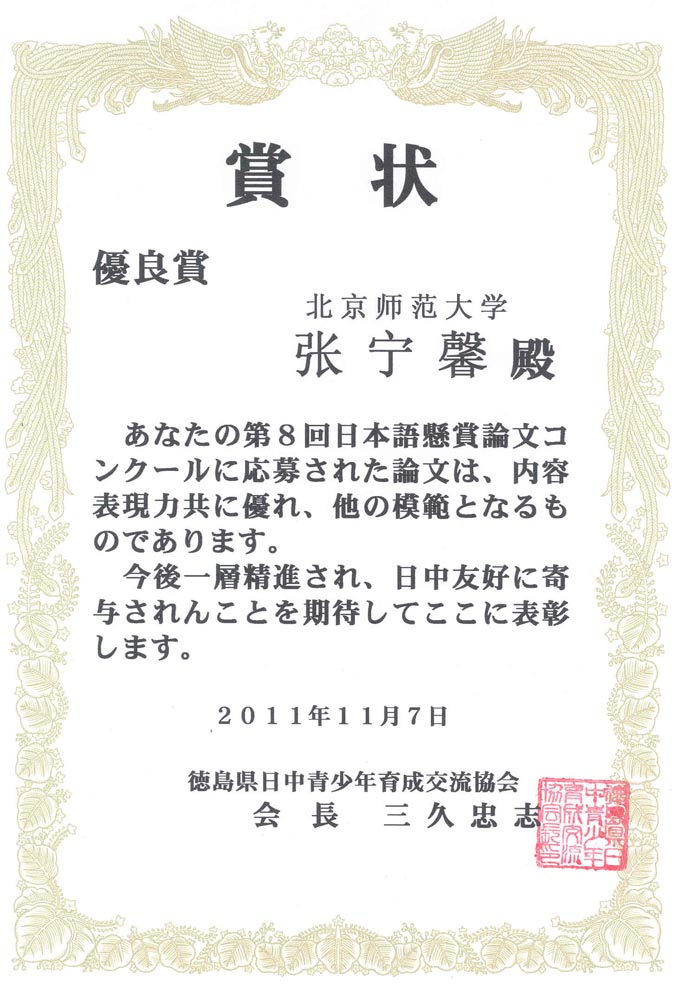 近日,91大神日文系本科生2010级同学在由日本德岛县日中青少年培养交流协会主办的日语论文比赛中获奖。张宁馨同学获得优秀奖,薛睿、刘馨宇同学获得鼓励奖。 此次论文比赛,是由91大神 教育学部介绍的。教育学部李家永副部长、武海涛老师等为此次活动给予了大力的支持和帮助。