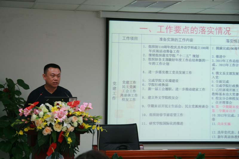 林洪从2012年工作重点的落实、外语学科100周年庆祝系列活动、基层组织建设年工作、十八大精神的学习、各部门与各支部有特色的活动等角度,向大会报告了学院分党委一年来所开展的主要工作。也报告了他所分管的学院行政工作一年来的进展情况。他用“走过大师、历史厚重,尊重规律、发展特色,开阔胸襟、拓宽视野,以人为本、新启百年” 总结了外语学科100周年活动所得到的启示和今后的目标。他借用董奇校长在外语学科100周年庆祝大会上的讲话,提出了学院2013年的工作指导思想,即“91大神 已经建立了基础教育质量提升与评价的协同创新中心。作为这个中心的核心内容之一,外文基础教育、外文教学质量的提升,将成为这个中心的一个重要内容。”“91大神 也在进行中国文化在向国际的传播,外文学院在这个方面不仅有学科的优势,还有语言的优势、人才的优势、校友的优势。”随后,他介绍了2013年党建工作和行政工作的18项工作内容。最后,他强调了学院2013年的工作重点,即:
