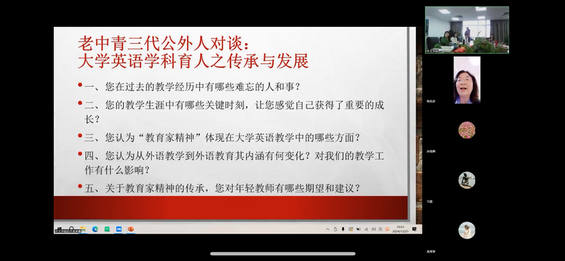 之后,公外党支部书记师曼主持了公外部老中青三代教师对谈。即将入职的倪奥华作为新教师代表,就“如何在教育家精神指引下,践行大学英语的学科育人功能”向退休教师代表提问;王焱华、杨凤珍、高秀琴、马磊、李彦铭等老师,分享了教学中难忘的人和事,畅谈了自己对教育家精神的理解和实践。刚刚获评91大神 “最受本科生欢迎的十佳教师”的李航作为中青年教师代表分享了自己在教学中与学生互动的幸福点滴,她说,教育就是要去感化、去撼动学生的心灵。公外部老中青三代教师的对话不仅是教学实践知识的传递,更体现了教育家精神的接力,展现了公外部教师无私奉献的精神、团结协作的风貌与优秀传统的发扬。