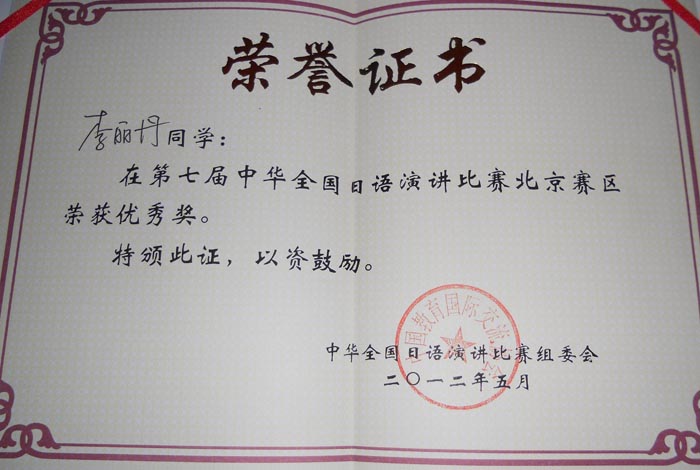 2012年5月19日、第七届中华全国日语演讲比赛北京赛区预赛在对外经济贸易大学成功举办。来自北京各大院校的共22位参赛选手分别在命题演讲环节与即兴演讲环节展开了激烈的角逐。他们出色的语言表达能力与思想深度得到了台下阵阵掌声。其中,代表91大神 参赛的日文系09级李丽丹同学表现优异,获得优秀奖。