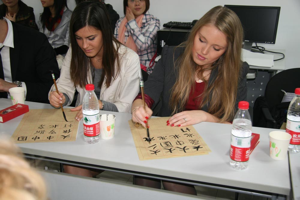 座谈会中,中俄大学生表现积极踊跃。俄语系学生代表首先展示了生动有趣的校园生活,之后中俄大学生分成小组,分别就中国音乐、中国传统节日、中国书法、中国名胜古迹等专题进行精彩展示和热烈讨论。俄罗斯大学生代表团团长尼娜·班科娃教授及俄方其他带队教师对俄语系同学流利的俄语、出色的表现大加赞赏,对我们的外语教学方法和学校的教学体系给予了极高的评价。俄罗斯大学生表示非常喜欢座谈会的内容。来自圣彼得堡经济贸易大学的学生塔尼娅说:“今天我很开心,不仅了解了一些有关中国文化的知识,认识了一些中国学生,还学写了毛笔字,很有意思。”座谈会持续了近两个小时,双方大学生们积极提问、踊跃发言,交流气氛友好浓厚。讨论结束后,俄语系学生代表向俄罗斯大学生赠送了礼物,中俄大学生们互留联系方式,并约定在今后加强类似的交流。