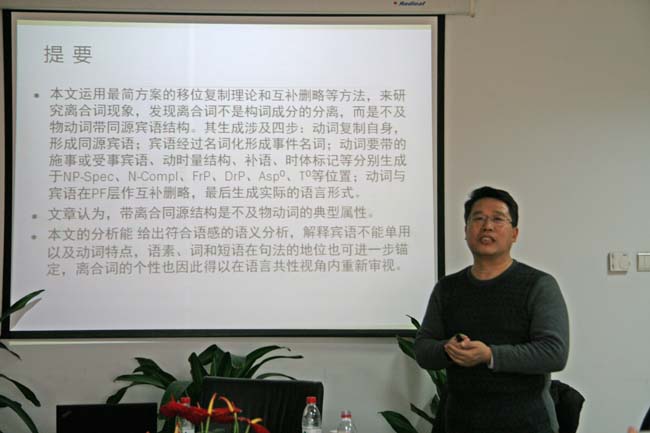 潘海华教授来外文学院讲座2013-12-3012月25日下午,应外文学院邀请,香港城市大学潘海华教授在后主楼1020室做了“离合词和同源宾语结构”的学术讲座。外文学院的教师、博士生、硕士生和访问学者参加了此次报告会。 -